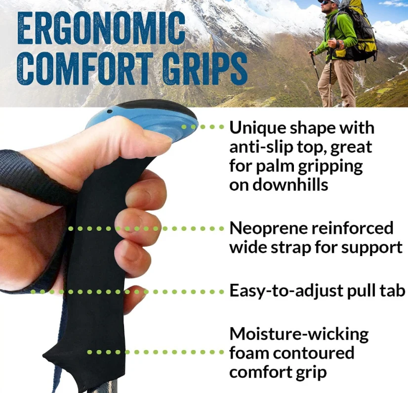 Tiang trekking lipat pegangan ganda, udara tiang lipat 2-piece yang dapat disesuaikan / berjalan / trekking yang runtuh menjadi hanya 13,5 inci dan beratnya masing-masing kurang dari 11 ons. Hadiah yang sempurna untuk pencinta perjalanan. Pilih tiang yang sesuai dengan tinggi Anda dan pilihan genggaman Anda.